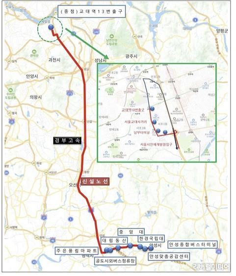 [리버럴미디어=공소리 기자] 안성시는 국토교통부 대도시권광역교통위원회 노선선정 심의에서 “안성종합버스터미널~서울남부터미널~교대역을 잇는 광역버스 광역버스 신규 노선이 26일 최종 선정됐다고 밝혔다.