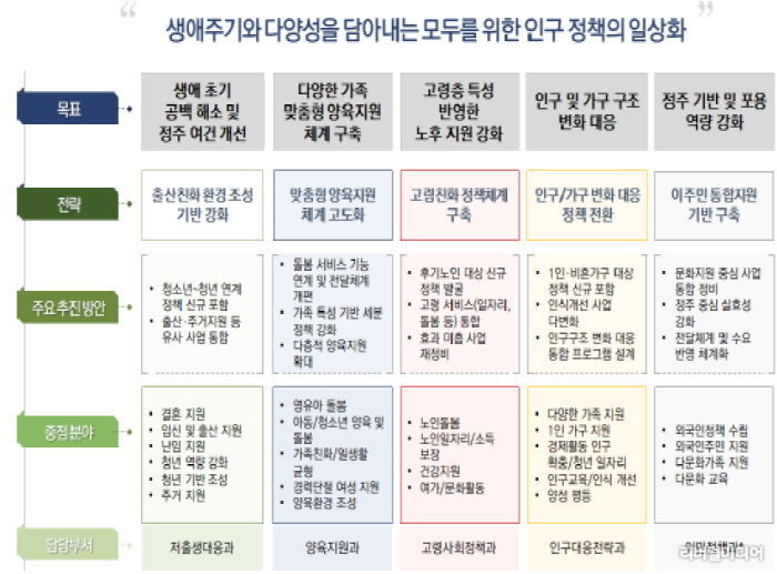 보고서는 경기도 인구정책의 비전을 ‘생애주기와 다양성을 담아내는 모두를 위한 인구정책의 일상화’로 설정하고, ▲생애 초기 공백 해소 및 기반 조성 ▲다양한 가족형태 맞춤형 양육지원 체계 구축 ▲고령층 특성 반영한 노후지원 강화 ▲인구 및 가구 구조 변화 대응 ▲정주 기반 및 포용 역량 강화라는 5대 정책목표를 제시했다.