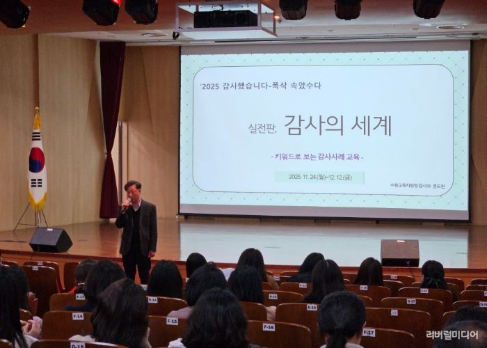 [리버럴미디어=공소리 기자] 경기도수원교육지원청은 12월 3일 관내 학교와 소속 직원을 대상으로 ‘감사(監査)했습니다–폭삭 속았수다’ 공연연계형 감사사례교육을 운영했다. 이번 교육은 지난해에 이어 2년 연속 수원시립예술단의 찾아가는 예술무대와 협력해, 한 해 동안 감사와 업무에 힘쓴 교직원과 직원을 격려하고자 마련됐다.