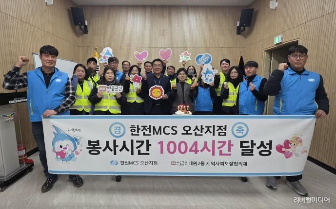 [리버럴미디어=공소리 기자] 오산시 대원2동 지역사회보장협의체는 지난 4일 한전MCS 오산지점과 함께 봉사 누적 1004시간 달성 기념행사를 개최하고, 그동안 지역 곳곳에서 꾸준히 나눔을 실천해 온 직원들의 노고를 격려하는 뜻깊은 시간을 가졌다. 이번 성과는 단기간의 활동이 아닌 지속적인 민·관 협력과 꾸준한 연계로 이뤄낸 결실로, 지역사회에서도 큰 의미를 지닌다.