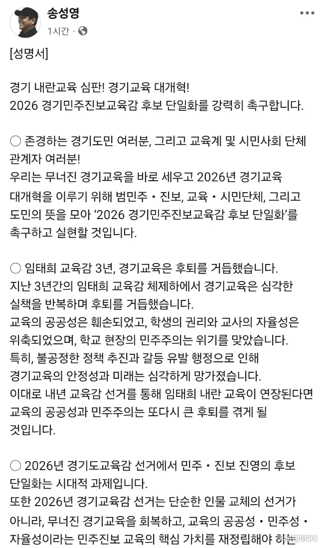 [리버럴미디어=공소리 기자] 송성영 경기교육혁신연대 발족 준비 위원회 위원장이 11일 페이스북을 통해 2026 경기민주진보교육감 후보 단일화를 촉구하는 성명서를 게시했다.
