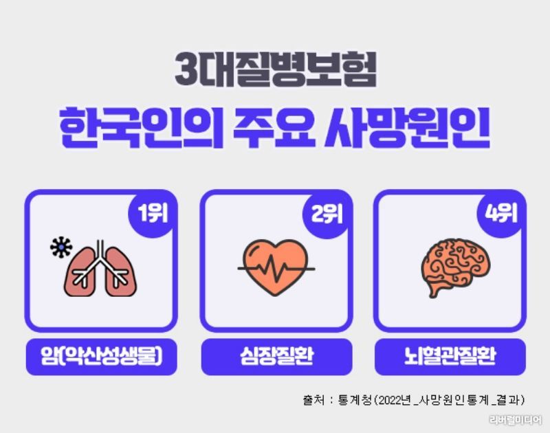 [리버럴미디어=공소리 기자] 흔히 3대질병이라 일컫는 암, 심혈관질환, 뇌혈관질환은 통계청 발표자료에 따르면 한국인의 주요 사망원인 중에서 3위 폐렴을 제외하고 1~4위를 차지하고 있으며, 이전부터 지금까지도 살면서 가장 먼저 대비해야 하는 치명적인 질병으로 강조되고 있다. 이러한 중대질병에 대비하기 위하여 상기 세가지 치명적인 질병을 집중보장하는 3대질병진단비보험을 많이 가입하고 있다. 3대진단비보험은 각각의 질병을 중점적으로 보장하면서도 가입자 특성에 맞는 특약을 추가함으로써 종합건강보험으로도 활용할 수가 있다.