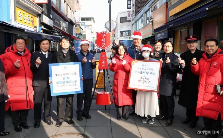 안성시는 행정안전부에서 열린 공무원 노사문화 우수행정기관 인증제 심사 결과 우수행정기관으로 선정되며 시상금 가운데 250만 원을 노사 공동 성금으로 마련해, 안성 명동거리에서 열린 ‘2025년 구세군 자선냄비 시종 행사’에서 기부했다.