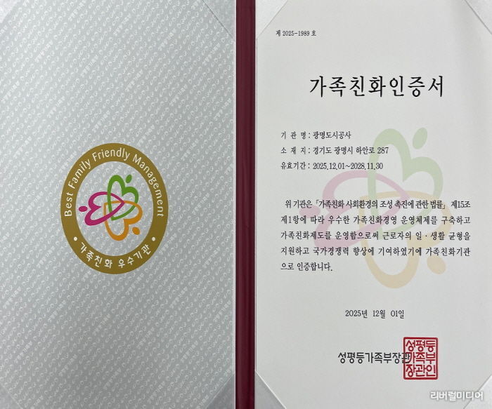 [리버럴미디어=공소리 기자] 광명도시공사는 성평등가족부에서 주관하고 한국경영인증원에서 심사한 가족친화인증기관 재인증 심사를 통과하여 2025. 12. 1. ~ 2028. 11. 30.까지 ‘가족친화기관’으로 인증받았다고 밝혔다.