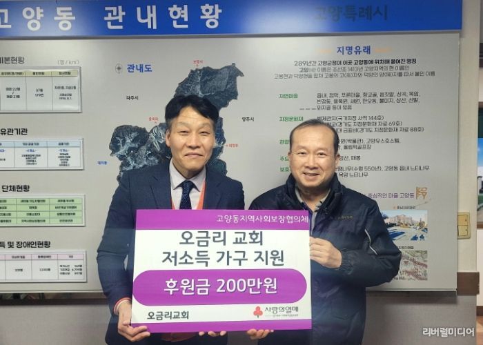 [리버럴미디어=공소리 기자] 고양특례시 덕양구 고양동은 지난 23일 오금리교회에서 경제적 어려움을 겪는 이웃을 돕기 위해 고양동 지역사회보장협의체에 후원금 200만 원을 기탁했다고 밝혔다.