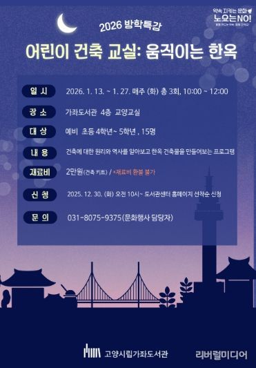 [리버럴미디어=공소리 기자] 고양특례시 가좌도서관은 2026년 1월 13일부터 27일까지 매주 화요일 3회차에 걸쳐 방학특강 프로그램 ‘어린이 건축 교실: 움직이는 한옥’을 운영한다고 밝혔다.