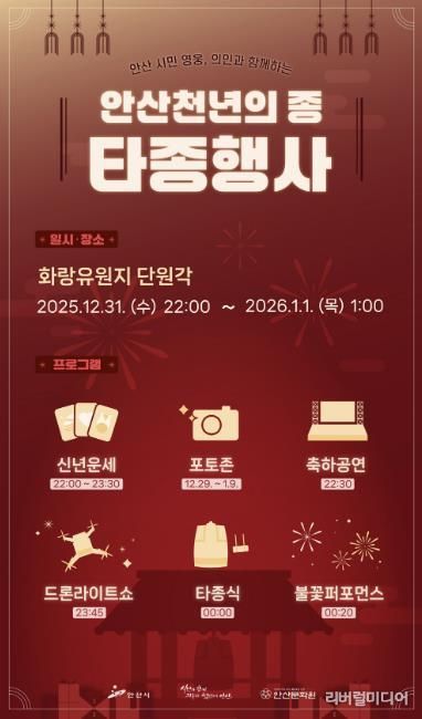 [리버럴미디어=공소리 기자] 안산시는 오는 31일 오후 10시부터 화랑유원지 단원각에서 ‘2026 안산 천년의 종 타종 행사’를 개최한다고 30일 밝혔다.