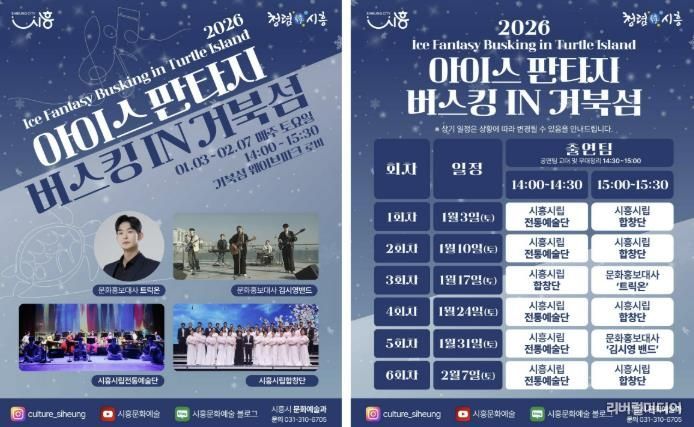 [리버럴미디어=공소리 기자] 시흥시는 지난 연말에 진행된 ‘2025 시흥 사운드 오브 윈터’의 열기를 잇는 후속 문화예술 프로그램으로, 겨울철 거북섬을 찾는 시민과 관광객에게 풍성한 즐길 거리를 제공하고자 ‘2026 아이스 판타지 버스킹 인 거북섬’을 운영한다.