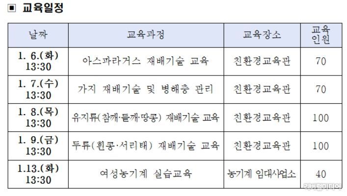 [리버럴미디어=공소리 기자] 여주시는 오는 1월 6일부터 13일까지 '2026년 새해농업인실용교육'의 일환으로 밭작물 분야 전문교육을 본격 추진한다고 밝혔다.
