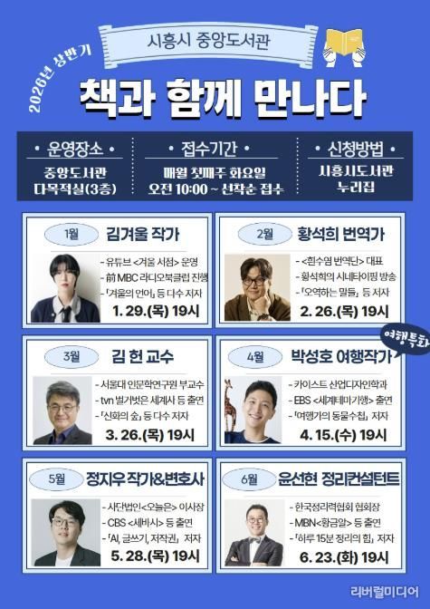 [리버럴미디어=공소리 기자] 시흥시중앙도서관은 2026년 상반기 시민의 독서문화 향유 기회 확대와 인문적 소양 강화를 위해 운영하는 저자강연 ‘책과 함께 만나다’ 강연 출연진을 공개했다.