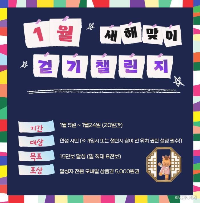 걷기챌린지는 공간과 인원 제약이 없는 건강증진 사업으로 걷기 앱 ‘워크온’을 통해 운영한다. 1월 걷기챌린지는 안성시민을 대상으로 1월 5일부터 24일까지 20일간 15만보 달성(1일 최대 8천보 인정)을 목표로 진행되며 목표를 달성한 참가자 전원에게 모바일 상품권 5,000원권을 증정한다.