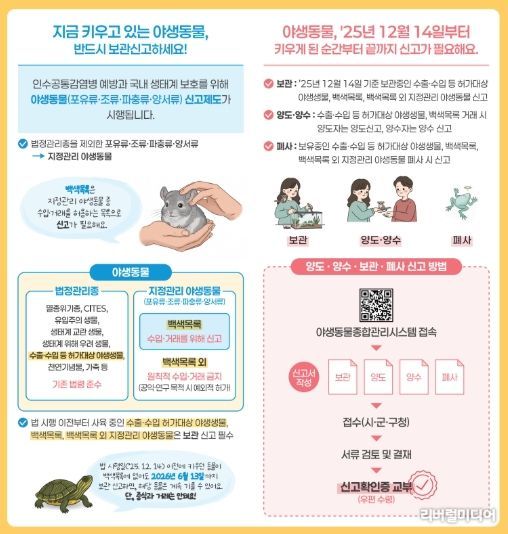 작년 12월 14일부터 시행하고 있는 이번 제도의 핵심은 관리 사각지대에 있던 야생동물을 제도권 안으로 편입하는 것이다. 기존에는 국제적 멸종위기종(CITES) 등 일부 법정관리종만 신고 대상이었으나, 앞으로는 살아있거나 알 상태의 포유류·조류·파충류·양서류, 즉 ‘지정관리 야생동물’을 단 1마리라도 사육할 경우 관할 지자체에 반드시 신고해야 한다.