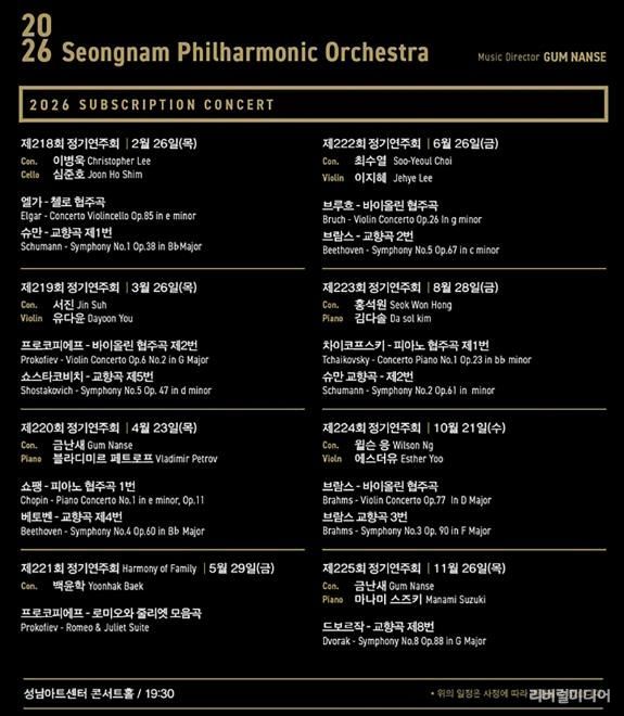 2026년 총 8회 정기공연 라인업을 확정하고, 1월 12일 오후 2시 시즌권을 놀(NOL) 티켓을 통해 오픈한다. 성남시향의 예술총감독 금난새 지휘자를 비롯하여 이병욱, 서진, 백윤학, 최수열, 홍석원, 윌슨 응의 지휘와 첼리스트 심준호, 바이올리니스트 유다윤, 피아니스트 블라디미르 페트로프, 바이올리니스트 이지혜, 피아니스트 김다솔, 바이올리니스트 에스더유, 피아니스트 마나미 스즈키 등의 화려한 협연자를 초청하여 올해 최고의 정기연주회를 마련한다.