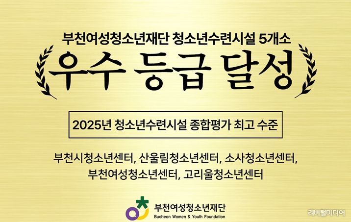 [리버럴미디어=공미소 기자] 부천여성청소년재단이 청소년수련시설 5개소(부천시청소년센터, 산울림청소년센터, 소사청소년센터, 부천여성청소년센터, 고리울청소년센터)가 성평등가족부 주관 2025년 청소년수련시설 종합평가에서 5개 시설 모두 최고 수준인 ‘우수’ 등급을 달성하는 쾌거를 이루었다.