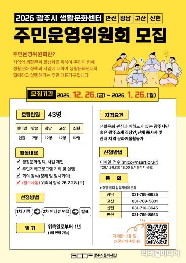 [리버럴미디어=공소리 기자] (재)광주시문화재단은 광주시 생활문화센터(만선·광남·고산·신현)에서 2026년에 활동할 주민운영위원회 위원을 통합 공개 모집한다고 밝혔다.
