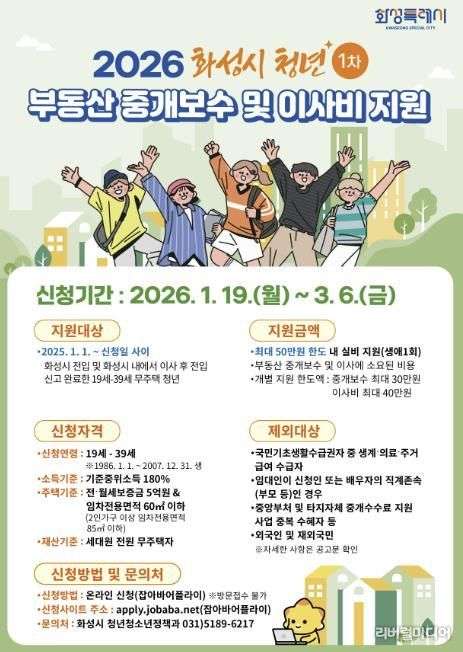 [리버럴미디어=공소리 기자] 화성특례시가 19일부터 3월 6일까지 청년들의 주거비 부담 경감 및 정주 여건 향상을 위한 ‘2026년 상반기 청년 부동산 중개보수 및 이사비 지원사업’ 신청을 받는다.