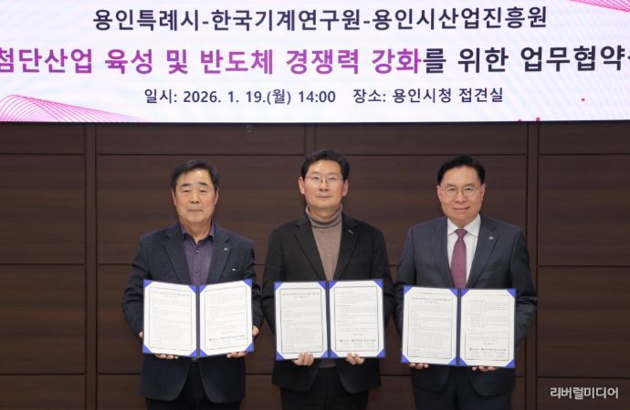 [리버럴미디어=공소리 기자] 용인특례시는 19일 시청 접견실에서 한국기계연구원(KIMM), 용인시산업진흥원과 ‘첨단산업 육성 및 반도체 경쟁력 강화를 위한 업무협약’을 체결했다.
