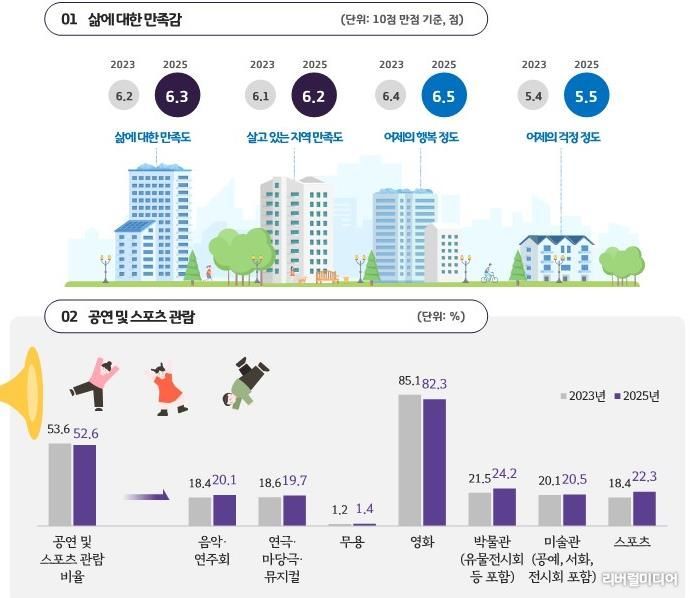 이번 결과는 2021년부터 2025년까지 삶의 만족·행복감, 여가·문화·관광 참여, 생활·안전 인식, 경제 체감 전반에서 완만하지만 일관된 개선 흐름을 보이는 점이 특징이다.