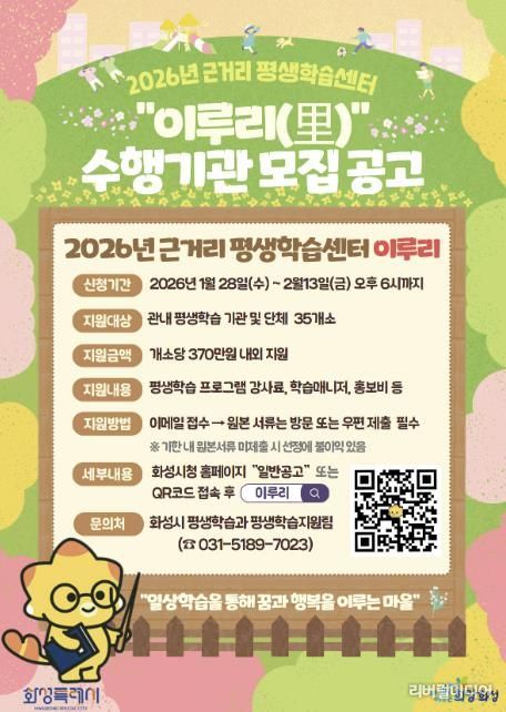 [리버럴미디어=공소리 기자] 화성특례시는 오는 28일부터 2월 13일까지 2026년 근거리 평생학습센터 ‘이루리’ 운영 지원사업의 수행기관을 공개 모집한다고 23일 밝혔다.