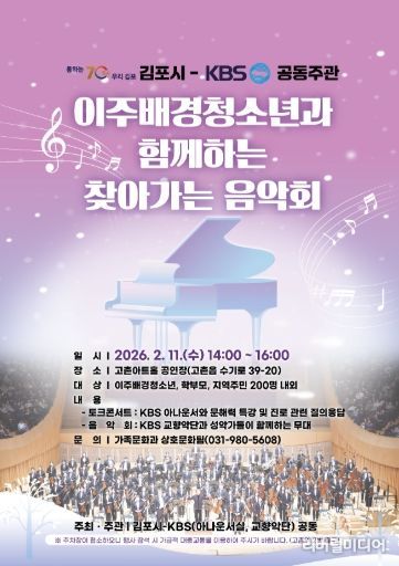 [리버럴미디어=공소리 기자] 김포시가 오는 2월 11일 오후 2시부터 4시까지 김포시와 KBS가 공동주관으로 고촌아트홀 공연장(연주홀)에서 『이주배경청소년과 함께하는 찾아가는 음악회』를 개최한다고 밝혔다.