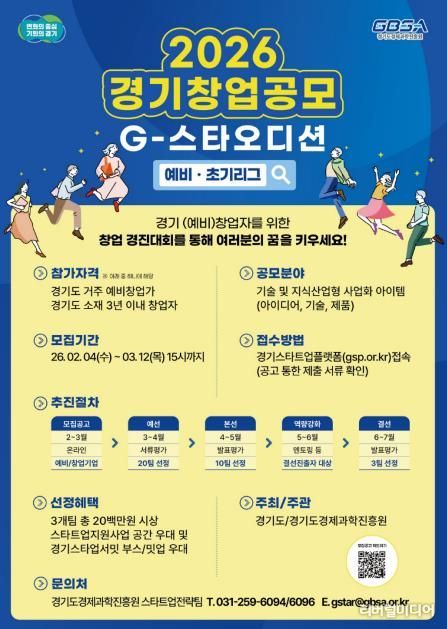 [리버럴미디어=공소리 기자] 경기도와 경기도경제과학진흥원이 다음달 12일까지 ‘2026년 경기 창업 공모(G스타 오디션) 예비·초기리그’ 참가자를 모집한다.