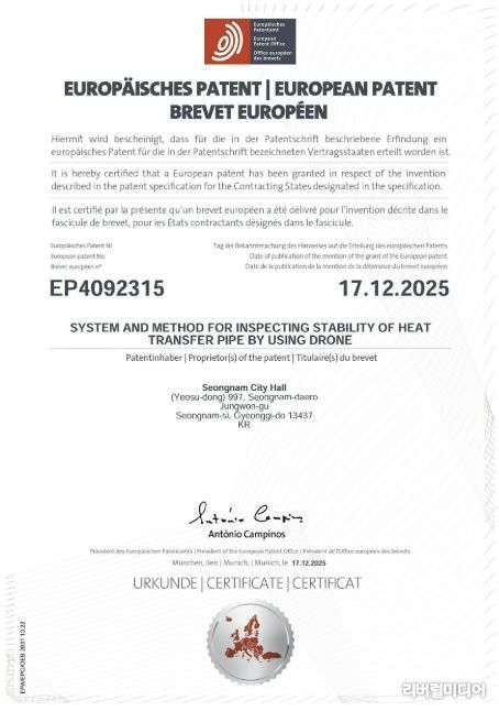 [리버럴미디어=공소리 기자] 성남시가 자체 개발한 ‘드론을 이용한 열수송관 안정성 검사 시스템’이 유럽특허(등록번호 EP4092315) 등록을 완료했다고 밝혔다. 이는 시 최초의 해외특허 등록 사례로, 지식재산의 해외 권리화를 통해 유럽 수출길을 여는 계기가 될 것으로 기대된다.