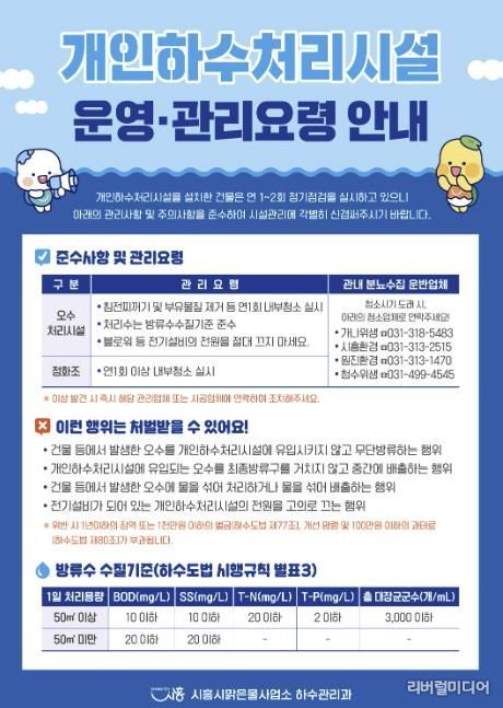 [리버럴미디어=공소리 기자] 시흥시는 하천 수질 오염을 예방하고 쾌적한 생활환경을 조성하기 위해 3월부터 관내 개인하수처리시설에 대한 지도점검을 본격적으로 실시한다.