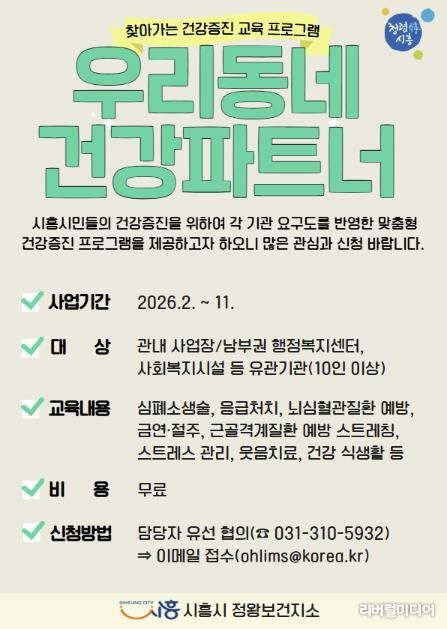 [리버럴미디어=공소리 기자] 시흥시는 시간적ㆍ거리적 제약으로 건강증진 서비스를 이용하기 어려운 시민들을 위해 2월부터 11월까지 찾아가는 건강증진 프로그램 ‘우리동네 건강파트너’를 운영한다.