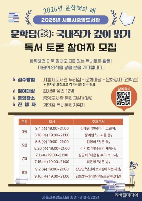 [리버럴미디어=공소리 기자] 시흥시중앙도서관은 ‘2026년 문학책의 해’를 맞아 국내 대표 문학 작가 소설을 주제로 한 독서토론 ‘문학담(談): 국내 작가 깊이 읽기’를 오는 3월부터 9월까지 운영한다.