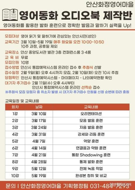 [리버럴미디어=공소리 기자] 안산시가 설립하고 안산대학교가 운영하는 안산화정영어마을이 성인 영어 학습자를 위한 ‘영어동화 오디오북 제작반’을 3월부터 5월까지 10주 과정으로 안산시 중앙도서관에서 운영한다고 4일 밝혔다.