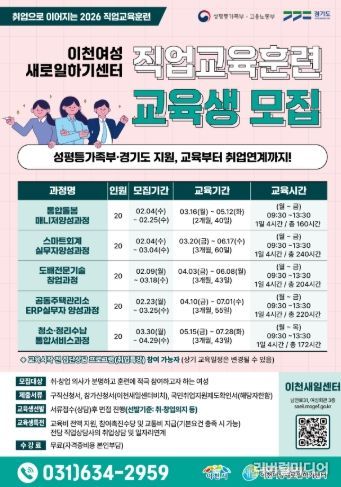 [리버럴미디어=공소리 기자] 이천여성새로일하기센터는 경력 단절 여성의 직업능력 개발과 취·창업 연계를 위해 2026년 직업교육훈련 교육생을 모집한다.