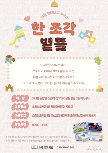 김혜순 소래빛도서관장은 “‘한 조각 볕뜰’은 아이들이 한자리에 머물며 차분히 몰입할 수 있는 시간을 제공하고자 기획한 서비스”라며, “부모와 아이가 함께 퍼즐을 맞추며 도서관에서의 경험이 더 깊어지길 기대한다”라고 말했다.
