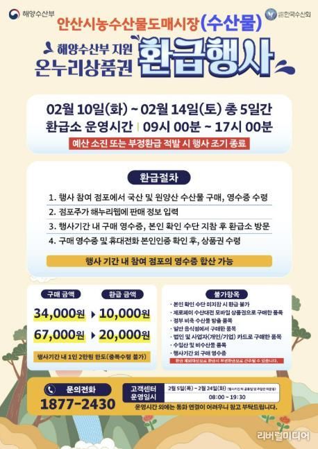[리버럴미디어=공소리 기자] 안산시는 설 명절을 맞아 국산 수산물 소비 촉진과 도매시장 활성화를 위해 오는 10일부터 14일까지 5일간 ‘2026년 설 온누리상품권 환급행사’를 개최한다고 5일 밝혔다.