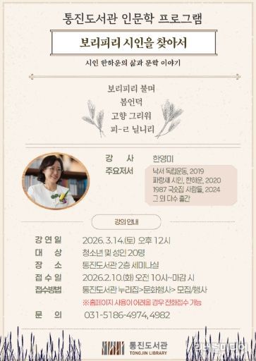 이번 강의는 2월 10일 오전 10시부터 통진도서관 누리집에서 신청할 수 있으며, 한하운 시인에 대해 관심 있는 청소년 및 성인 20명을 선착순으로 모집한다.