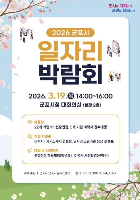 [리버럴미디어=공소리 기자] 군포시는 오는 3월 19일 오후 2시부터 시청 대회의실에서 ‘2026년 군포시 일자리 박람회’를 개최함에 따라 2월 10일부터 2월 27일까지 박람회에 참여할 기업체를 모집한다.