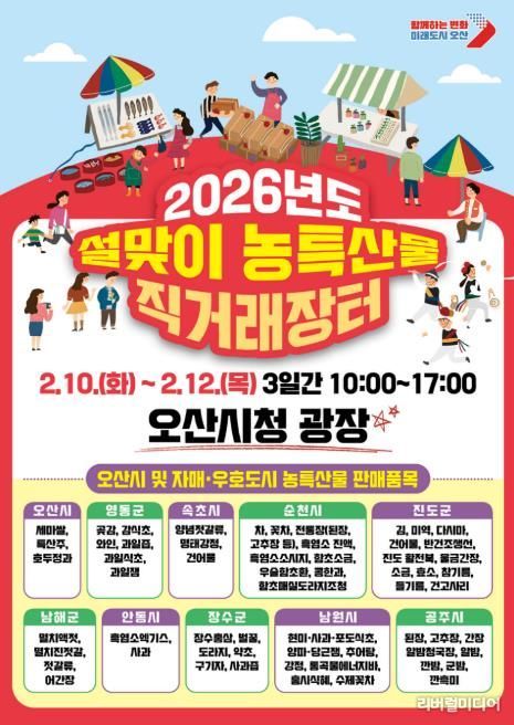 [리버럴미디어=공소리 기자] 오산시는 설 명절을 맞아 오는 2월 10일부터 12일까지 3일간, 오전 10시부터 오후 5시까지 오산시청 광장에서 자매·우호도시와 함께하는 ‘설맞이 농특산물 직거래장터’를 개최한다고 밝혔다.