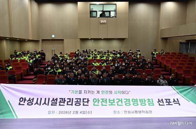 [리버럴미디어=공소리 기자] 안성시시설관리공단은 지난 2월 4일, 종사자와 시민의 생명 보호 및 안전한 시설 운영을 위한 ‘2026년 안전보건경영방침 선포식’을 개최했다고 밝혔다.