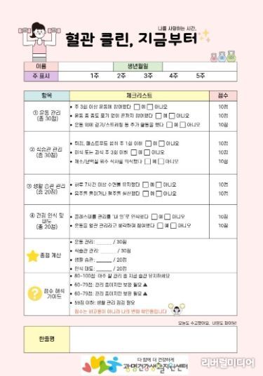 [리버럴미디어=공소리 기자] 광명시 광명건강생활지원센터가 시민들의 만성질환 예방과 자가 건강관리 역량 강화를 위해 ‘혈관 클린, 지금부터’ 프로그램을 운영한다.