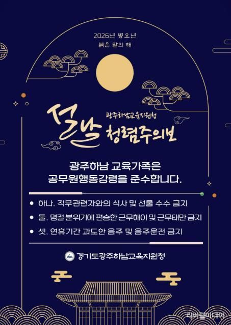[리버럴미디어=공소리 기자] 경기도광주하남교육지원청은 2월 9일, 2026년 병오년 설명절을 맞아 관내 교직원들이 청렴한 마음가짐으로 새해를 시작할 수 있도록‘교육장 청렴서한문’과‘청렴주의보’를 각급 학교에 전달했다.