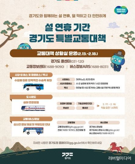 [리버럴미디어=공소리 기자] 경기도가 안전하고 편한 설 귀성길 조성을 위해 13일부터 18일까지 6일간을 ‘2026년도 설 연휴 특별교통대책기간’으로 정하고 시외버스 증차, 도로정보 실시간 안내, 긴급도로 복구 체계 구축 등 적극 대응한다.