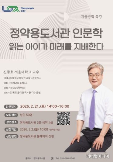 [리버럴미디어=공소리 기자] 남양주시는 오는 2월 21일 정약용도서관 3층 세미나실에서 겨울방학 인문학 특강 ‘읽는 아이가 미래를 지배한다’를 개최한다고 9일 밝혔다.