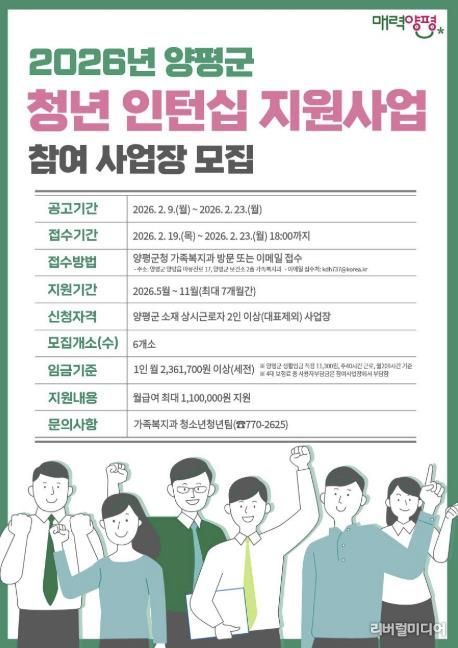 [리버럴미디어=공소리 기자] 양평군은 인력이 필요한 관내 사업장과 관내 거주 미취업 청년을 연계하고 사업장에 인건비를 지원하는 ‘청년 인턴십 지원 사업’ 참여 사업장을 오는 2월 19일부터 23일까지 모집한다.
