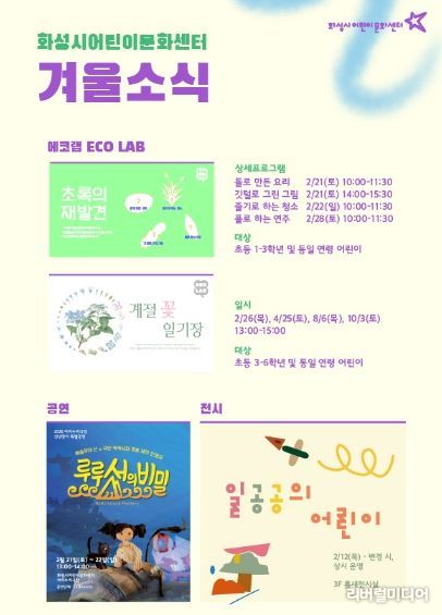 [리버럴미디어=공소리 기자] 화성시어린이문화센터는 새해를 맞아 지역 생태환경을 주제로 한 특별 교육 프로그램‘에코랩(Eco Lab)’을 운영한다고 9일 밝혔다.