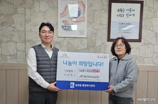 최선정 송죽동장은 “매년 잊지 않고 송죽동 이웃들을 위해 따뜻한 나눔을 실천해주시는 ㈜엑티브아이티에 깊이 감사드린다”며 “기탁해주신 후원금은 도움이 꼭 필요한 가구에 소중히 사용하겠다”고 전했다.