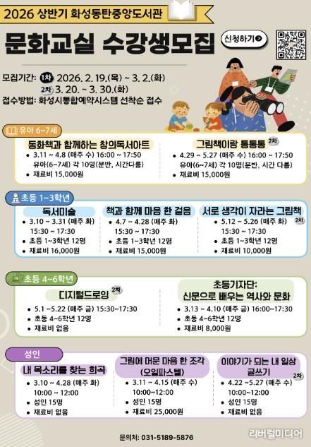 [리버럴미디어=공소리 기자] 화성특례시는 지난해 11월 3일 개관한 화성동탄중앙도서관에서 시민들이 다양한 독서·문화 활동을 즐길 수 있도록 2026년 상반기 문화교실 프로그램을 운영한다고 밝혔다.