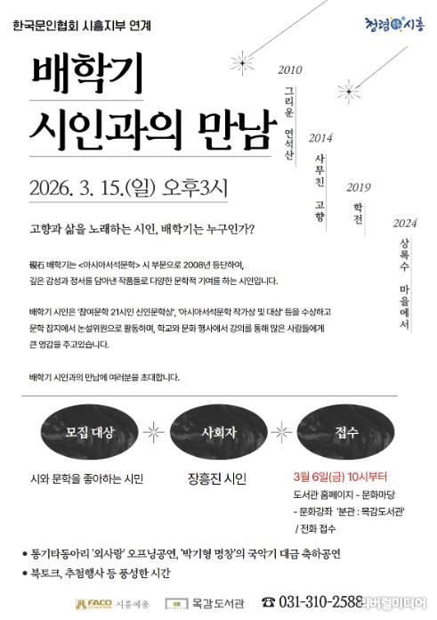 이번 만남은 3월 15일 오후 3시, 목감도서관 지하 1층 다목적실에서 진행되며, 시와 문학에 관심이 있는 50여 명의 시민과 함께한다. 시인이 직접 자신의 작품을 낭독하고, 시를 쓰게 된 계기와 창작 과정에 관한 이야기를 들려줄 예정이다. 또한, 시민들과 자유롭게 질문을 나누며 시와 삶에 대해 편안하게 대화하는 시간도 마련된다.