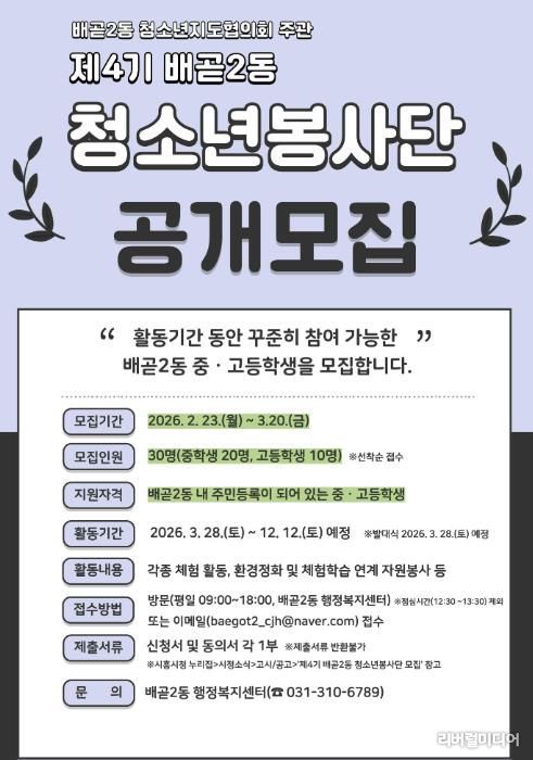 [리버럴미디어=공소리 기자] 시흥시 배곧2동 청소년지도협의회는 자원봉사와 다양한 체험활동에 참여할 제4기 배곧2동 청소년봉사단원을 모집한다.