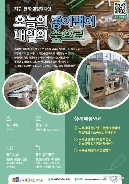 [리버럴미디어=공소리 기자] 수원시 칠보 생태환경체험교육관이 2월부터 12월까지 ‘지구, 한 땀 환경캠페인–오늘의 종이팩이 내일의 숲으로(종이팩 되살림)’를 전개한다.