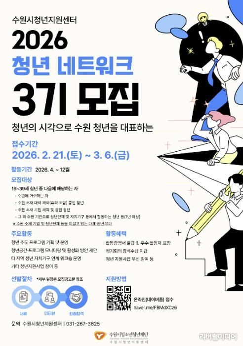 [리버럴미디어=공소리 기자] 수원시청소년청년재단 수원시청년지원센터는 2월 21일부터 3월 6일까지 2026년 청년 네트워크 단원 32명을 모집한다.