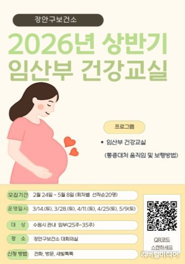 [리버럴미디어=공소리 기자] 수원시 장안구보건소가 3월 14일부터 5월 9일까지 25~35주 임부를 대상으로 ‘임신·출산 건강교실’을 운영한다.